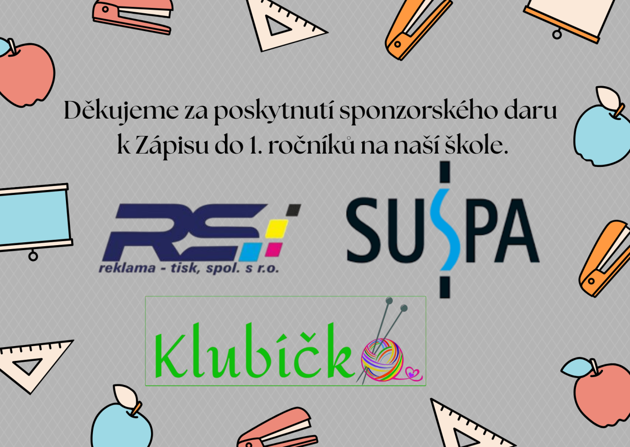 Velmi děkujeme firmě SUSPA CZ, Klubíčko Bor - paní Kosíková a RS Reklama - Tisk, spol. s. r. o. za poskytnutí sponzorského daru k Zápisu do 1. ročníků na naší škole.