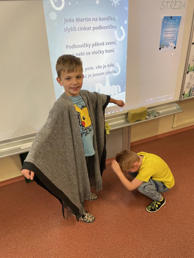 Prvňáčci pilně pracovali na projektu ke svatému Martinovi – počítali příklady, malovali obrázky, dramatizovali legendu, zpívali a opisovali krátké věty.