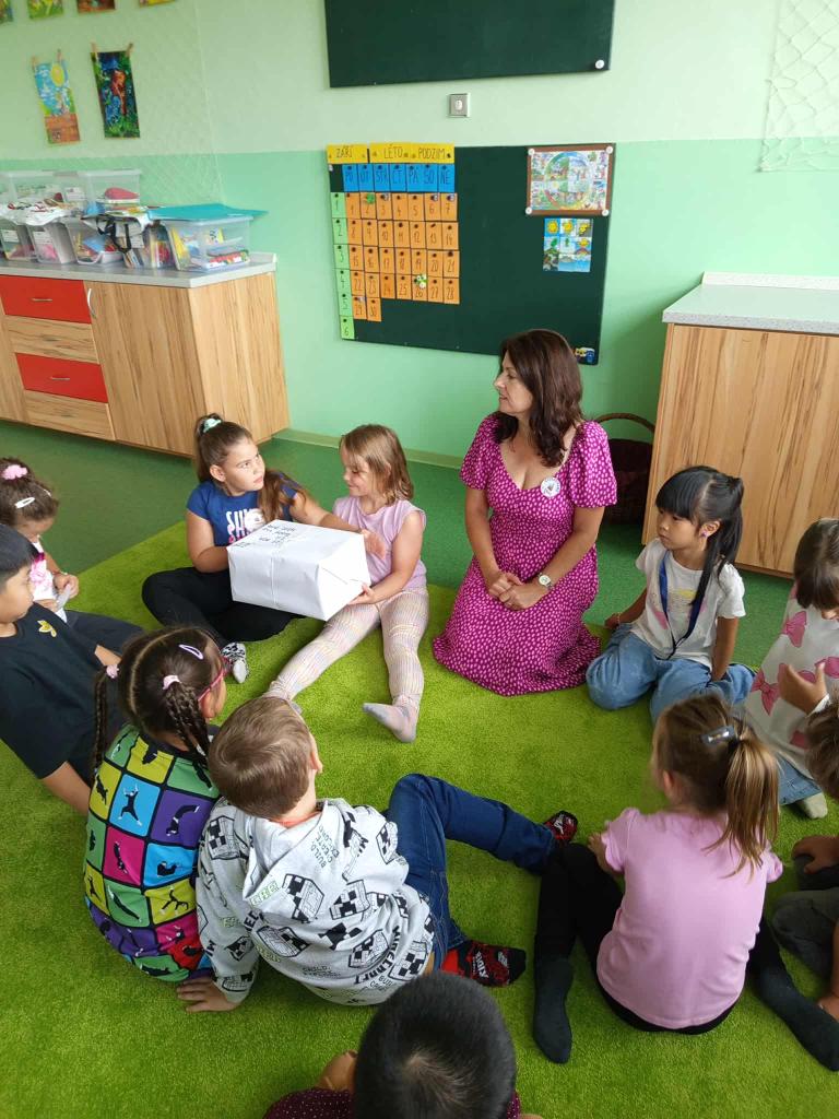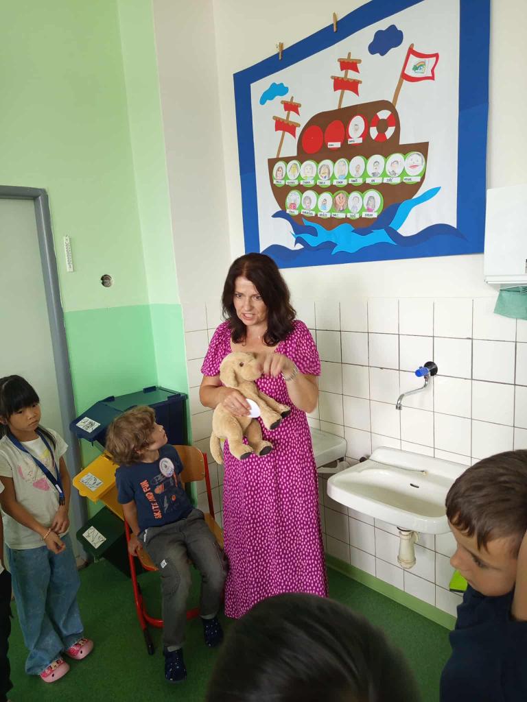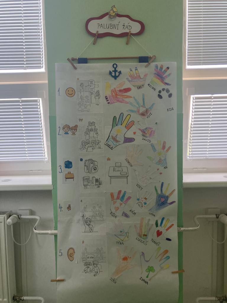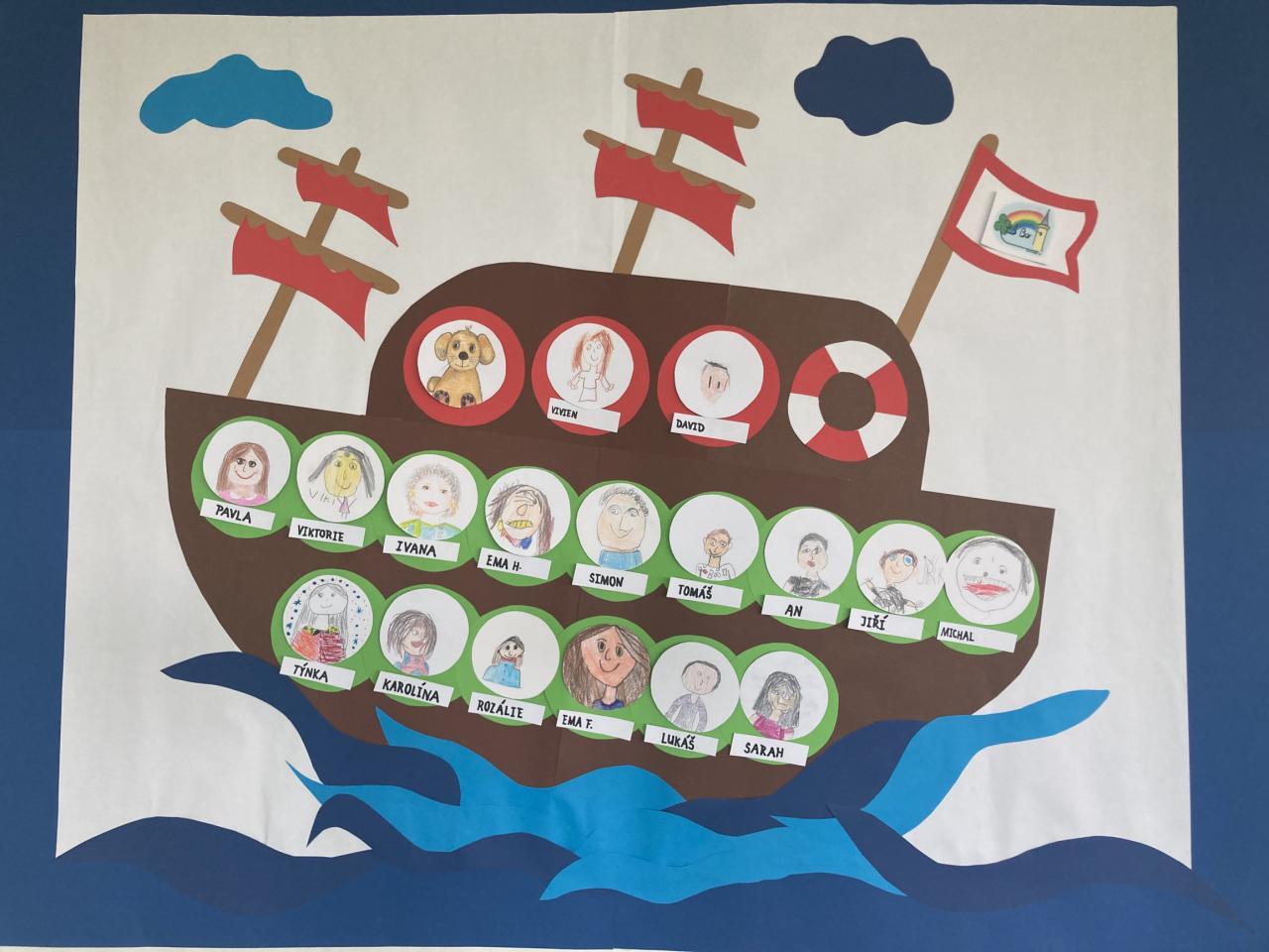 V prvním týdnu jsme přivítali maskota Edu, nakreslili svůj portrét a umístili ho na naši loď. Sestavili jsme společně pravidla třídy a obkreslili svoji ruku na důkaz toho, že se je budeme snažit respektovat, aby nám spolu bylo dobře. Vyplouváme vstříc novým zážitkům, dovednostem, poznání. Ať se nám na společné cestě první třídou daří!